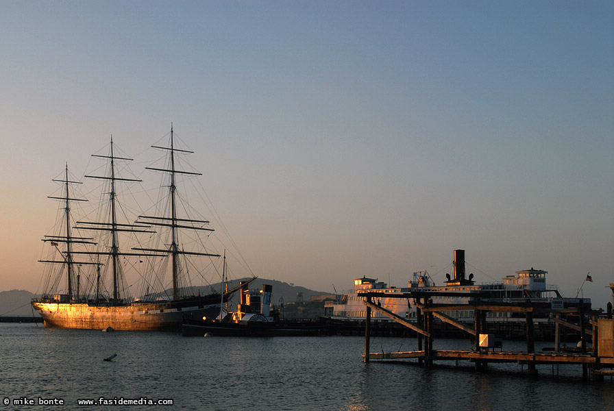 A beautiful evening down by the bay, as the setting sun lights up the ships at the Maritime National Park Association.